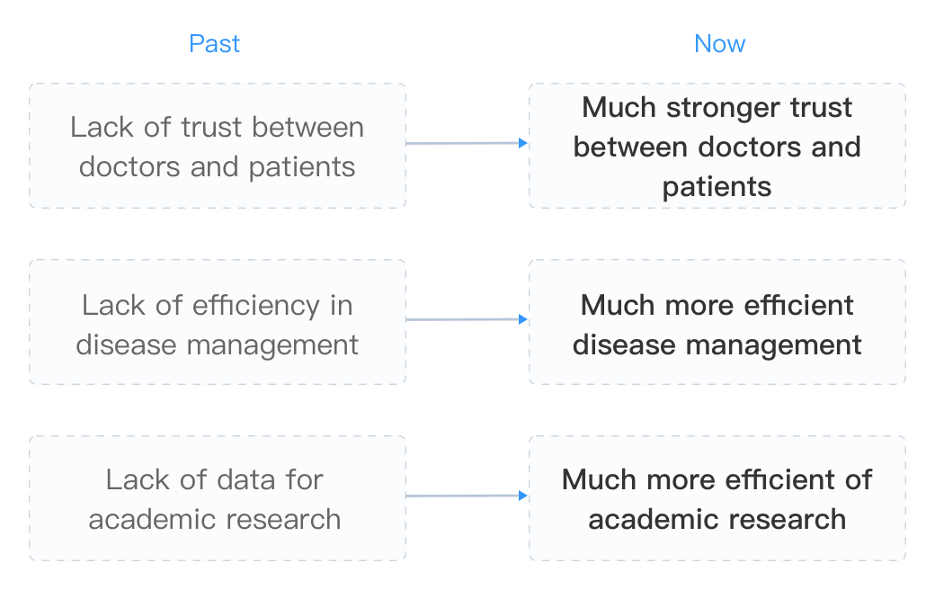 無紙化病情全記錄,互聯網問診、開方、拿藥一站式服務,每年上億次問診服務,智能輔助診斷研究 Paperless medical records; one-stop online service of consultation, prescription and drug purchase; enabling hundreds of millions of consultations annually and facilitating diagnostic research